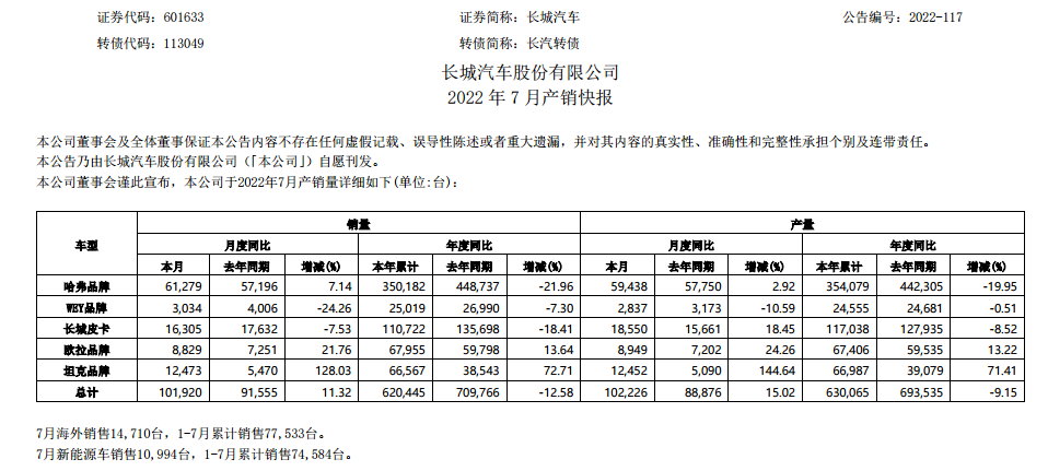 從業(yè)務來看,長城汽車2022年前7個月累計銷量約62萬輛,同比減少12.58%。分車型來看,1-7月,哈弗品牌共銷約35.02萬輛,同比減少21.96%;WEY品牌共銷2.5萬輛,同比減少7.3%;長城皮卡共銷約15.57萬輛,同比減少18.41%;歐拉品牌共銷6.8萬輛,同比增加13.64%;坦克品牌共銷約6.66萬輛,同比增加72.71%。