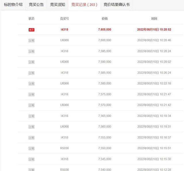 激烈競價203次,以760.5萬元成交