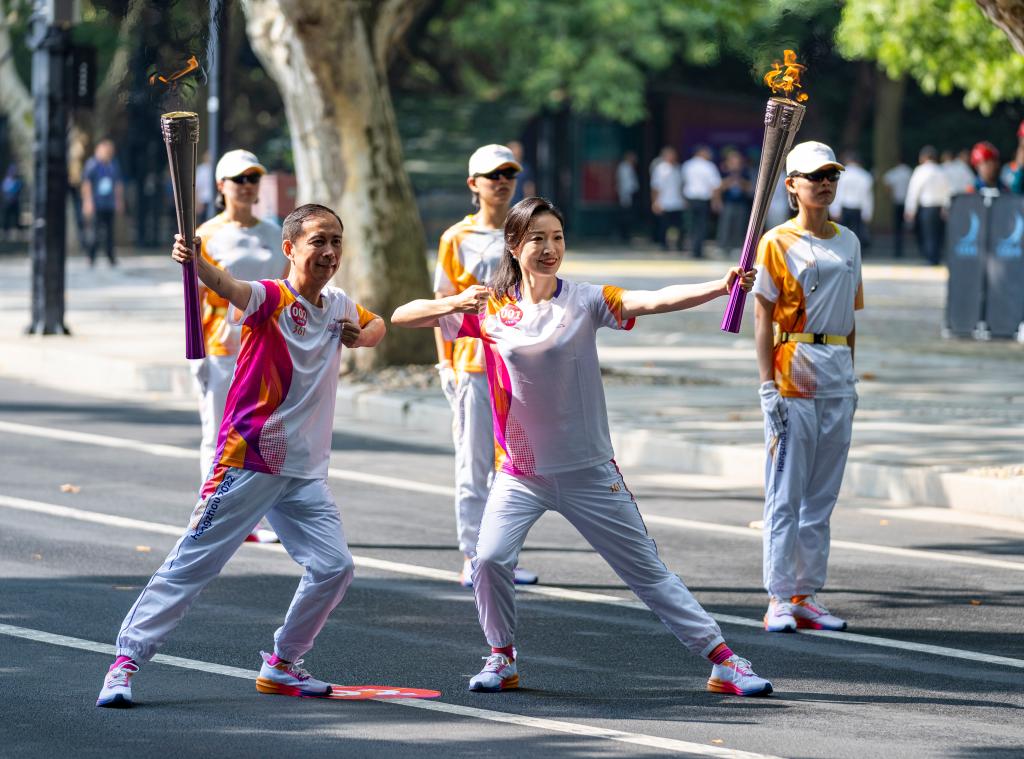9月8日,火炬手羅雪娟(右)和張勇參與火炬?zhèn)鬟f。攝影師:孫非