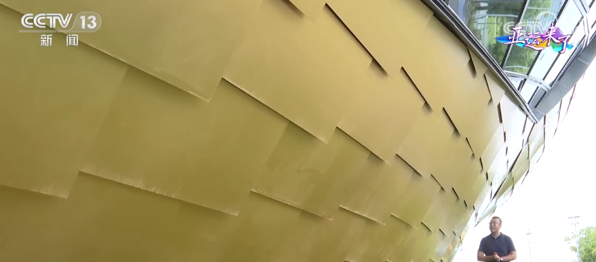 總臺央視記者黃達:我們不僅要展現歷史的斑駁感,還要給這個龐大的玉琮”建立一個穩定的外觀。設計師們花費了近一年的時間,最終選擇了黃色的陽極氧化鋁作為外飾面材料。這種材料不僅能夠保持長時間的顏色穩定,還具備自清潔的功能,當下雨時,塵土會被清洗干凈。