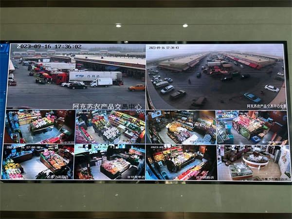 ▲新疆果業(yè)農(nóng)產(chǎn)品交易中心大廳的實時監(jiān)控圖。人民日報記者白陽攝