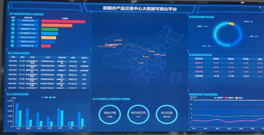 在交易中心大廳,顯示屏正動態(tài)展示著農(nóng)產(chǎn)品批發(fā)市場線上交易情況、線上實時交易數(shù)據(jù)、線上月度交易總額、林果市場主要產(chǎn)品占比、林果網(wǎng)批發(fā)交易行情、新疆特色農(nóng)產(chǎn)品價格指數(shù)等信息。新疆匯宗農(nóng)副產(chǎn)品電子交易市場負(fù)責(zé)人王小明介紹說,通過這個大數(shù)據(jù)可視化平臺,我們能夠動態(tài)了解價格變化指數(shù)、全面掌握市場行情,從而更好指導(dǎo)市場內(nèi)商戶及時調(diào)整銷售計劃。