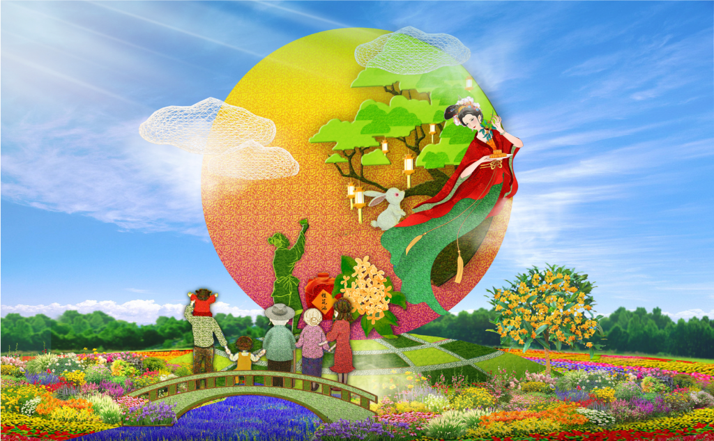 國(guó)慶假期與中秋假期“喜相逢”,今年的花壇里自然少不了中秋元素。西單西北角正布置“花好月圓”花壇。“這個(gè)花壇描述的場(chǎng)景是一家人在中秋團(tuán)聚。”藍(lán)海浪說(shuō),“一個(gè)花壇濃縮萬(wàn)家燈火,道出花好月圓。”