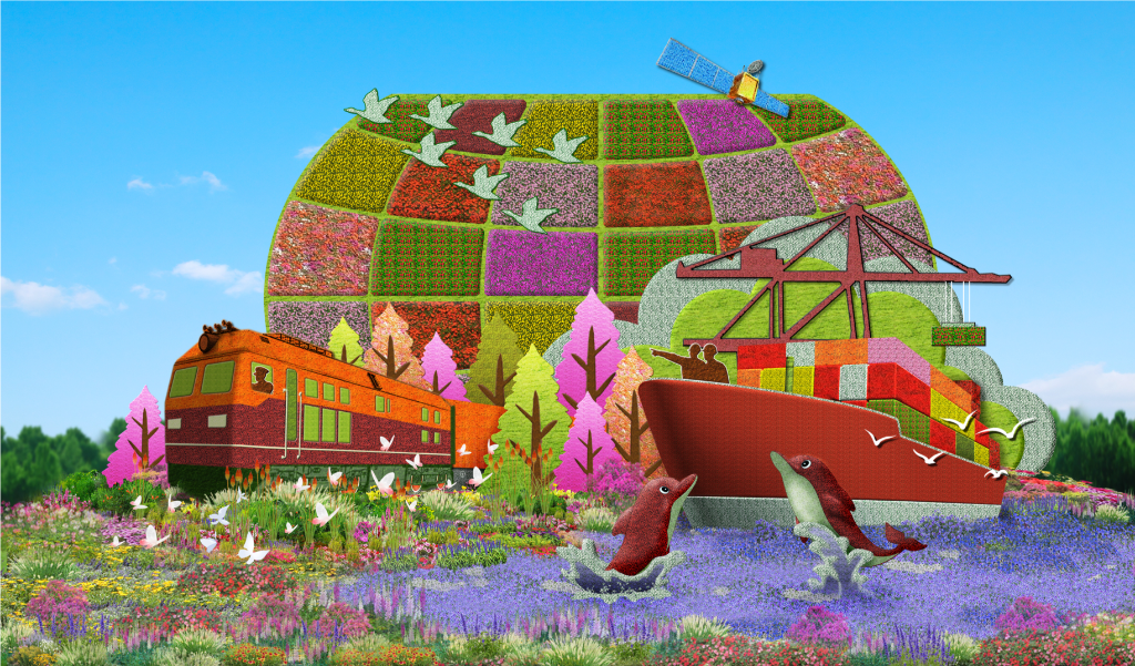 今年恰逢共建“一帶一路”十周年。在西單東南角,“幸福之路”花壇以中歐班列、貨輪以及海豚為主景,寓意共建共享、合作共贏。