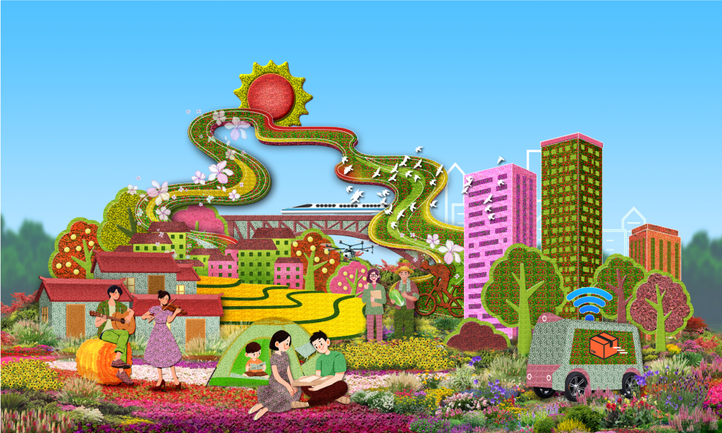 東單東南角“共同富裕”花壇,以欣欣向榮的城鄉(xiāng)融合發(fā)展為場(chǎng)景,描繪了中國(guó)式現(xiàn)代化全體人民共同富裕的美好藍(lán)圖。