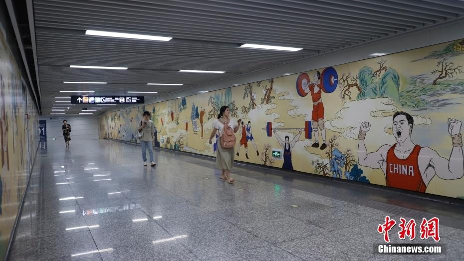 地鐵內的運動健兒和山水畫組合成的長卷。中新社發 肖健 攝
