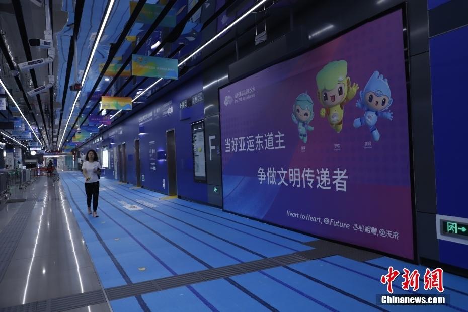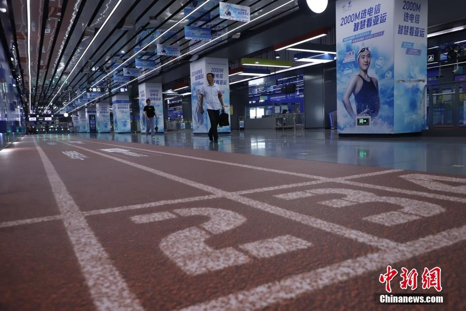 地鐵站內的跑道樣式的地貼裝飾。中新社發 肖健 攝