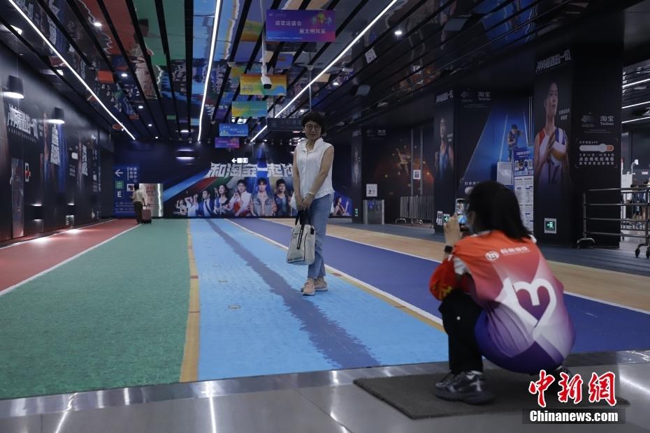 市民在地鐵站內與各式賽道地貼合影。中新社發 肖健 攝
