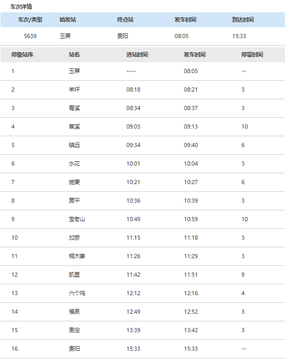 5640/5639次列車開行于貴陽和玉屏之間,中間途經(jīng)大大小小14個站——羊坪、青溪、蕉溪、鎮(zhèn)遠、水花、施秉、黃平、寶老山、加勞、桐木寨、凱里、六個雞、福泉、貴定。