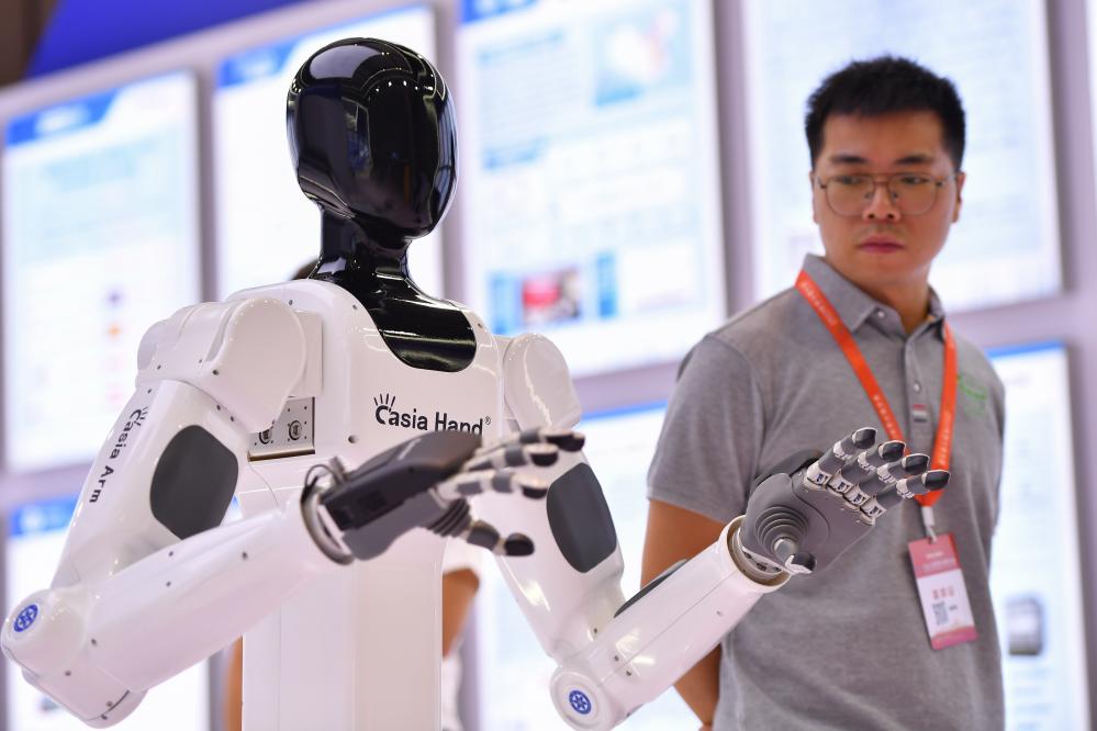 9月15日,參觀者在2023世界計算大會專題展上參觀服務機器人。新華社記者 陳澤國 攝
