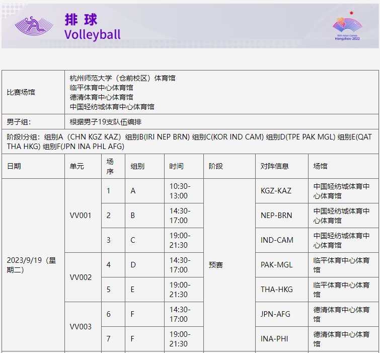 杭州亞運會排球項目比賽時間為9月19日-10月7日,在杭州師范大學(倉前校區)體育館、德清體育中心體育館、臨平體育中心體育館、中國輕紡城體育中心體育館舉行,決賽在杭州師范大學(倉前校區)體育館和臨平體育中心體育館舉行,共產生2枚金牌。