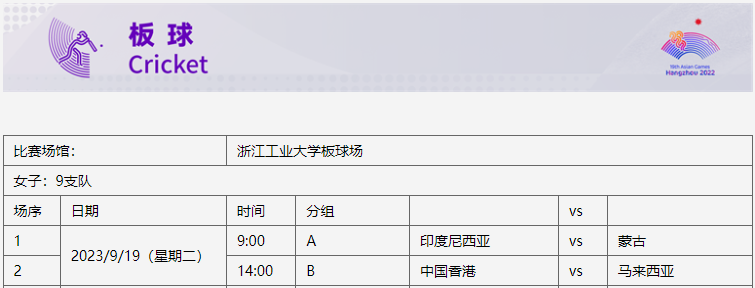 杭州亞運會板球項目比賽時間為9月19日-10月7日,在浙江工業大學(屏峰校區)板球場舉行,共產生2枚金牌。