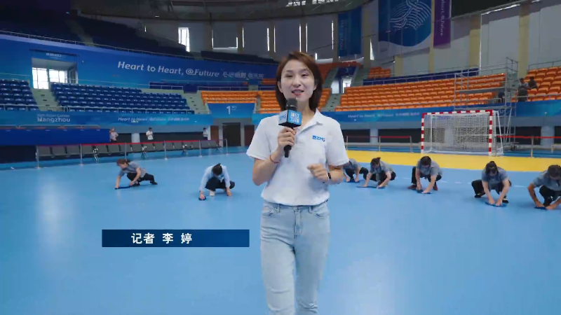 記者 李婷:地上是全新鋪設(shè)的懸浮式地板和乳膠墊,來(lái)跳一下,彈性十足,能起到很好的保護(hù)和緩震作用。在賽后,這里具備承接各種國(guó)際級(jí)賽事的專業(yè)能力。
