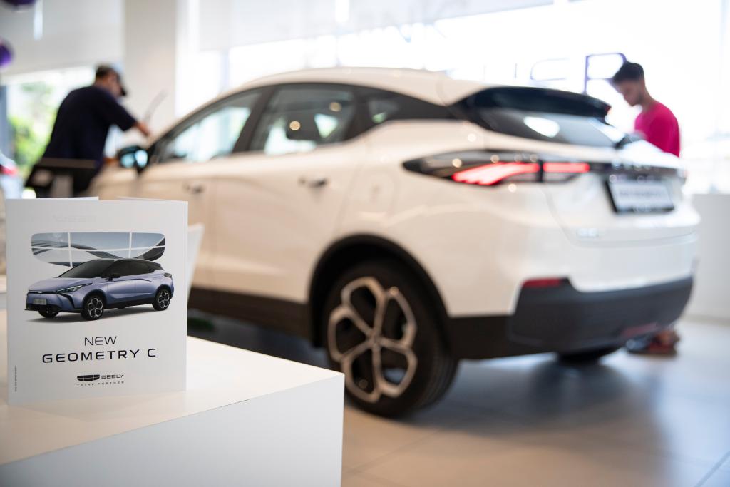 這是6月21日在以色列特拉維夫一家吉利銷售點拍攝的新款幾何C電動車型。當日,吉利汽車在以色列發(fā)布新款幾何C電動車型。新華社記者 陳君清 攝