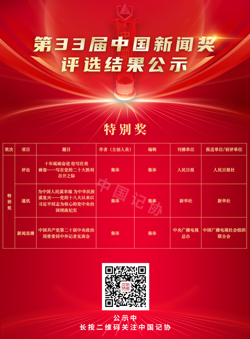 關于公示第33屆中國新聞獎評選結果的公告