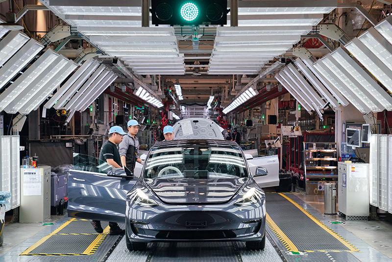 工作人員在特斯拉上海超級工廠總裝車間生產線上作業(2023年5月12日攝) 馬寧攝/本刊