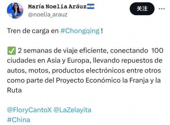 尼加拉瓜電視4臺(tái)記者諾埃里亞·阿勞茲發(fā)文稱,每天有上千噸貨物由中歐班列從重慶運(yùn)往歐洲,在15天里途徑哈薩克斯坦、俄羅斯、白俄羅斯、波蘭,最終抵達(dá)德國(guó)。中歐班列使世界上100多個(gè)城市連接在一起。