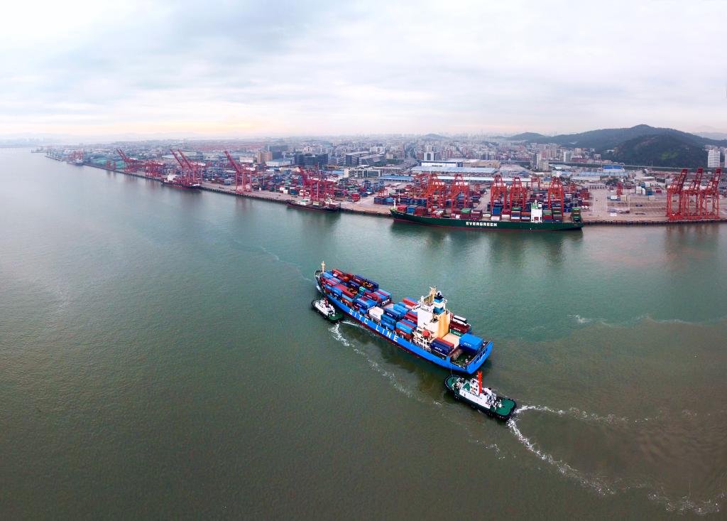 在福建自貿區廈門片區東渡港區,一艘貨輪向碼頭靠攏(2017年8月26日無人機照片)。(新華社記者姜克紅攝)