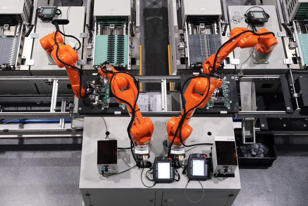 5月22日,在紫光恒越(杭州)技術有限公司“未來工廠”,機械臂在工作中。新華社記者 杜瀟逸 攝