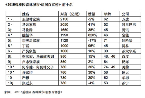 2016年胡潤百富榜發(fā)布 王健林居首馬云第二